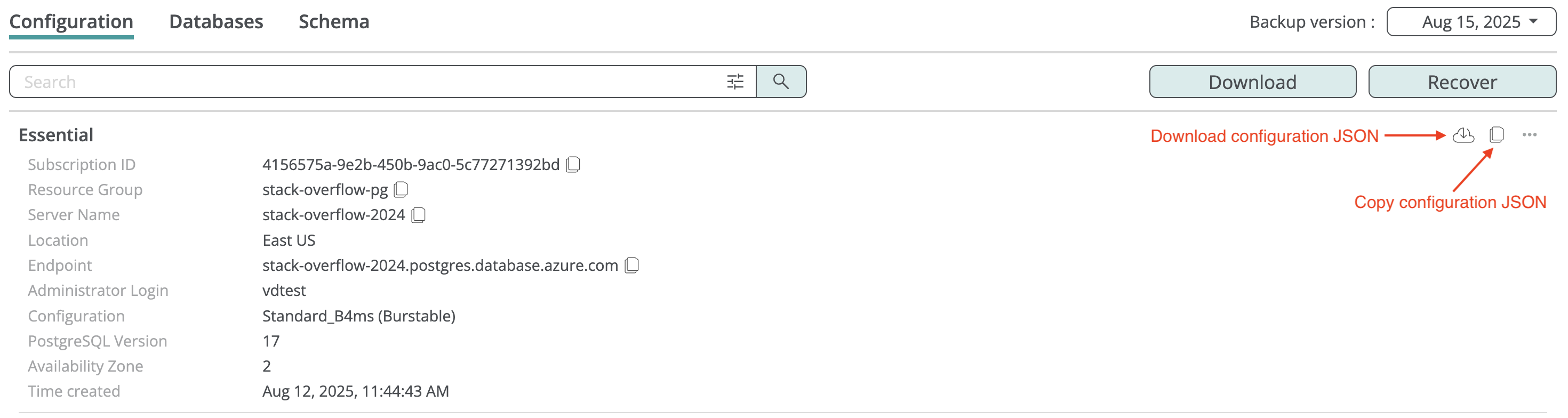 You can copy or download a JSON file with the Azure configuration of the PostgreSQL server from the backup browse view.