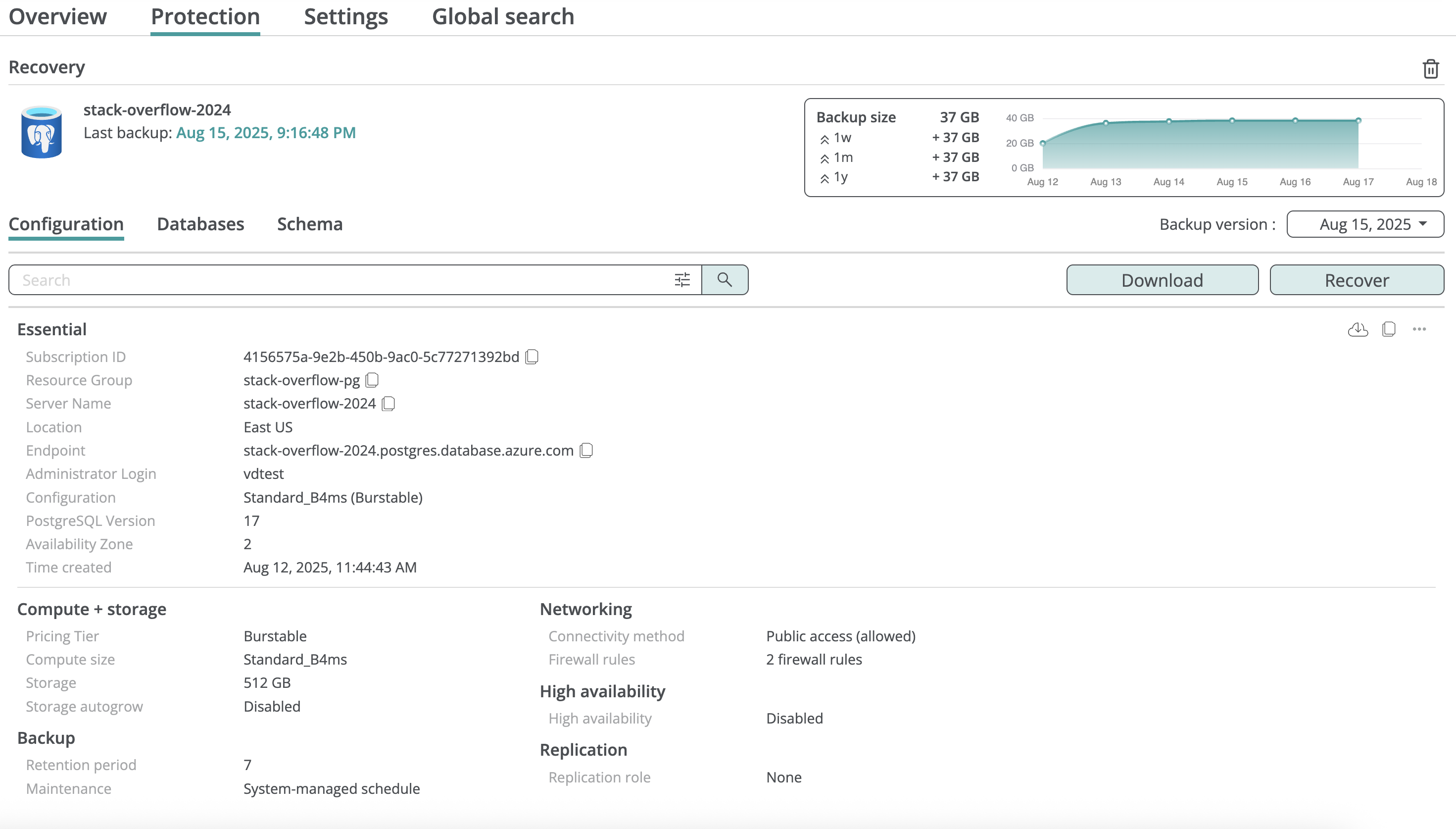 Azure PostgreSQL server backup includes all databases that reside on that server, and you can browse configuration, schema, and table data for each database.