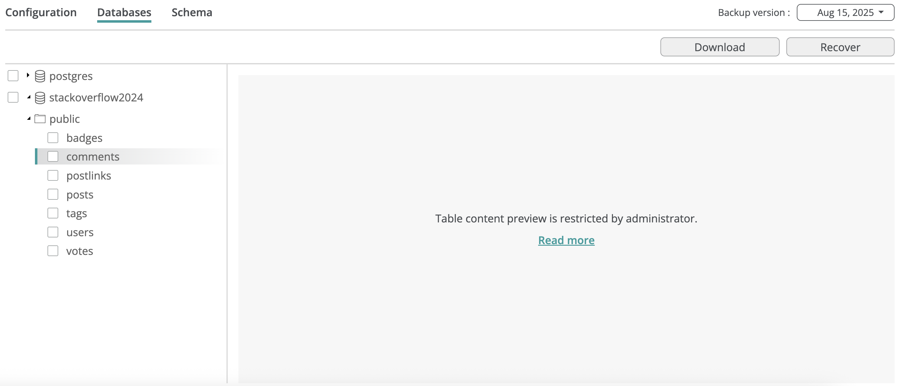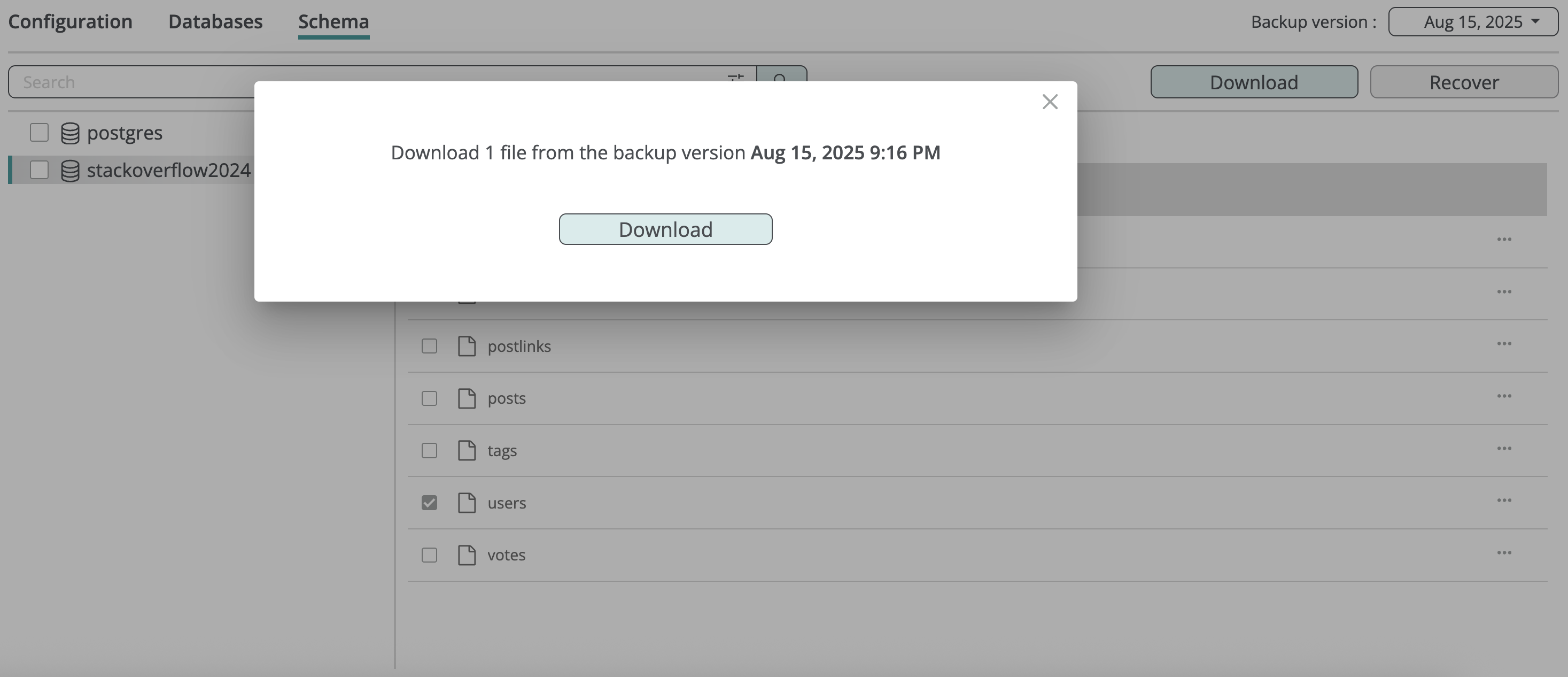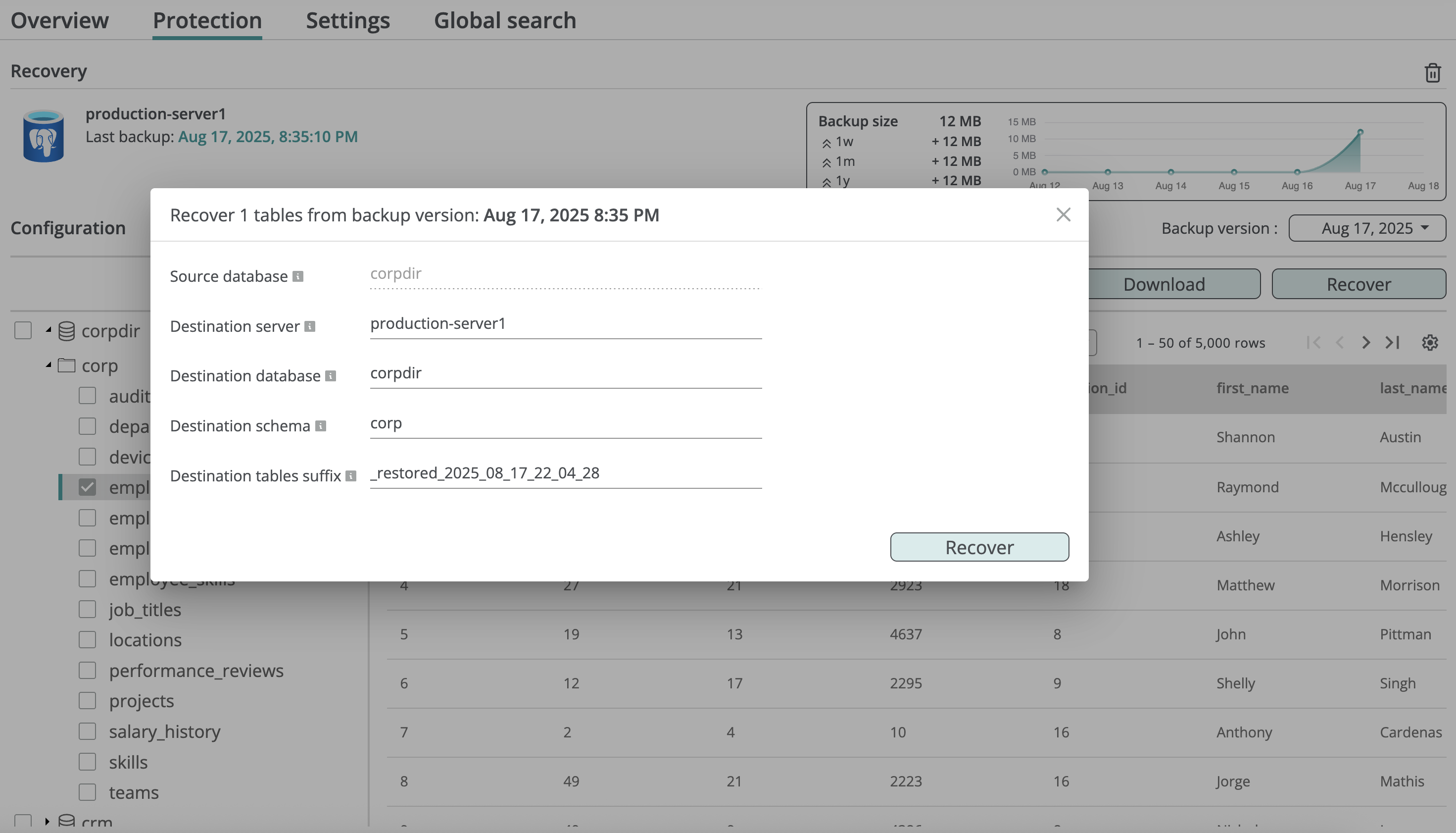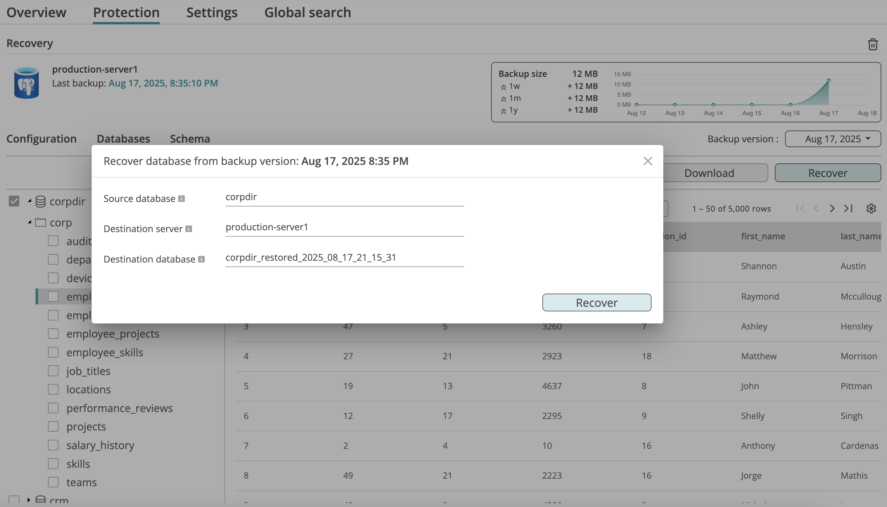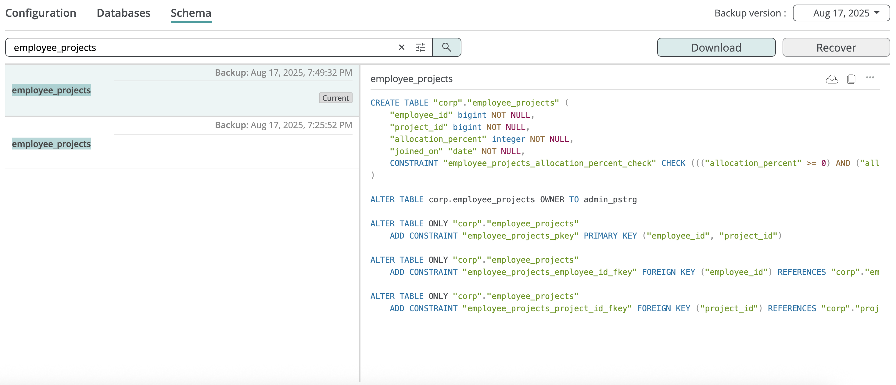 You can restore a database from a backup snapshot, creating a new database in the selected PostgreSQL server, or restore an individual table into an existing database. Full database recovery preserves the entire schema and constraints; table-level recovery restores only the basic table definition to avoid conflicts with the existing database.