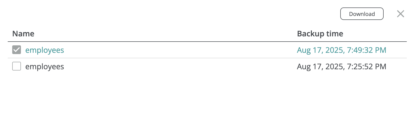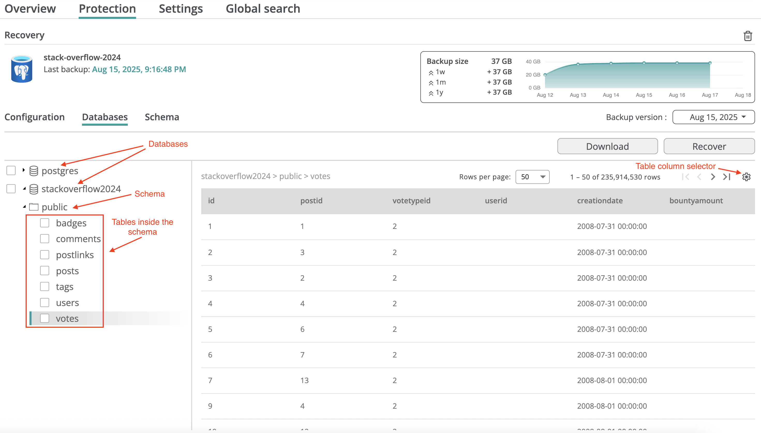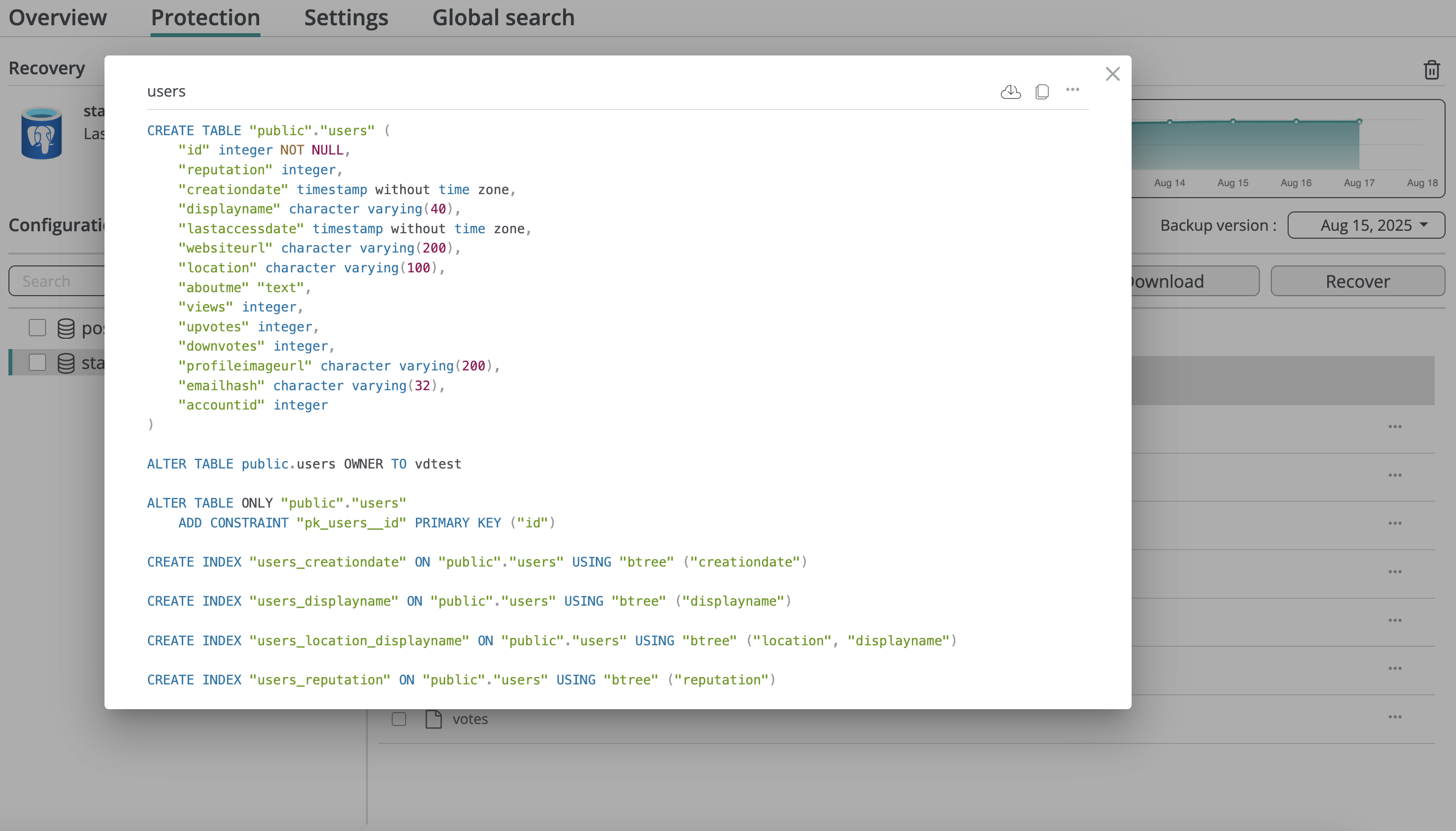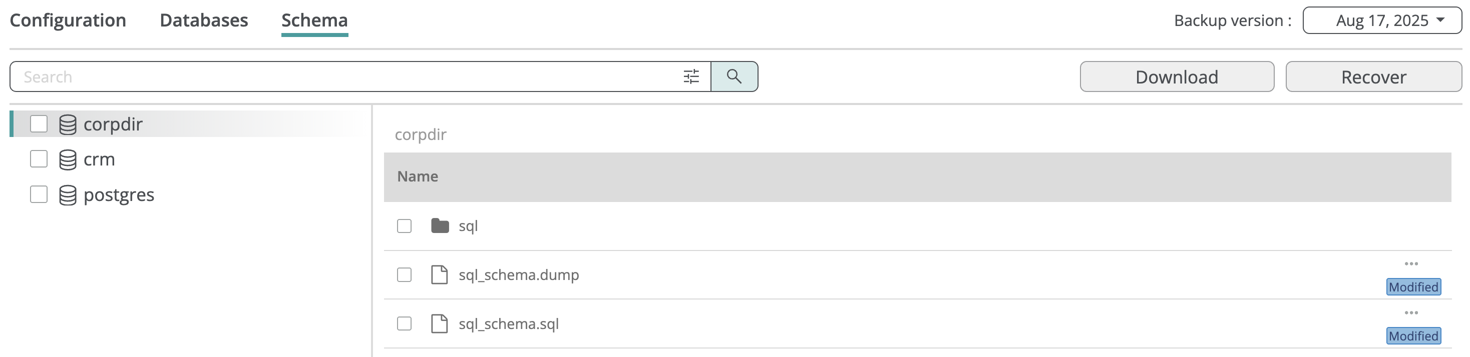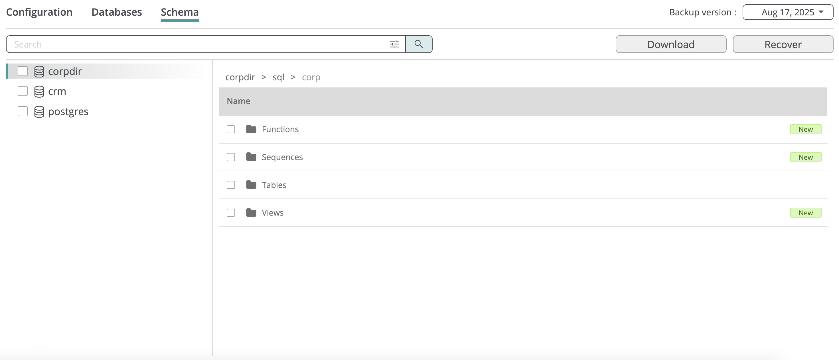You can restore a database from a backup snapshot, creating a new database in the selected PostgreSQL server, or restore an individual table into an existing database. Full database recovery preserves the entire schema and constraints; table-level recovery restores only the basic table definition to avoid conflicts with the existing database.