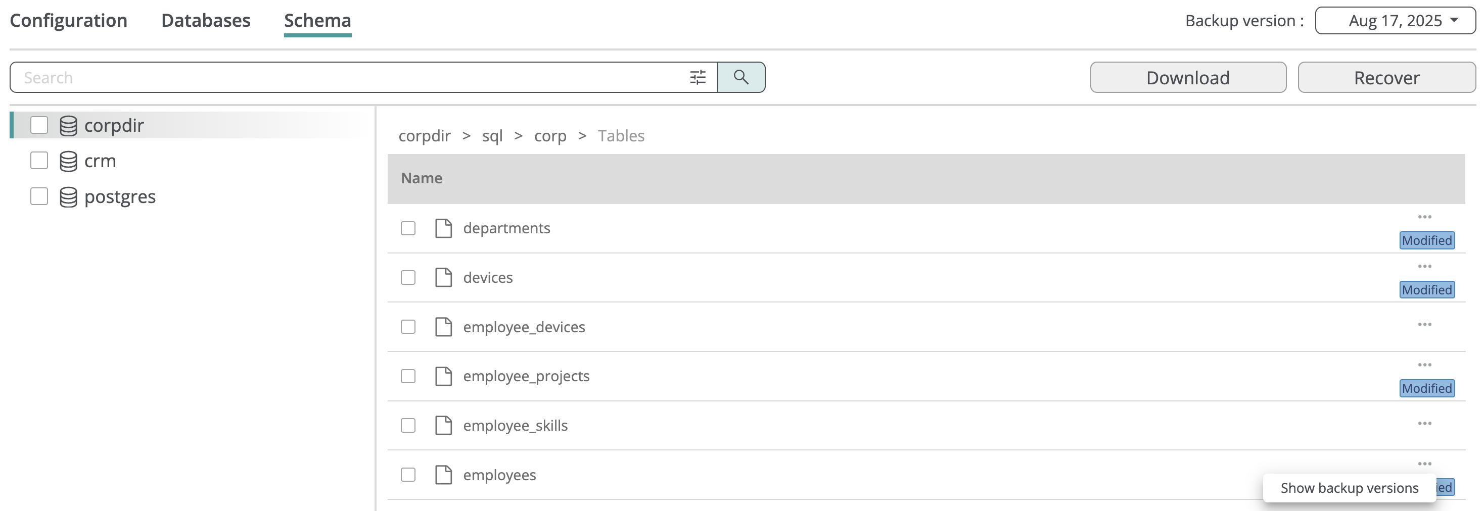 To view all versions of an SQL script stored by the service, click the three-dot icon in the corresponding row and select Show backup versions. A dialog will appear, listing each script version along with the backup snapshot times in which each version exists.