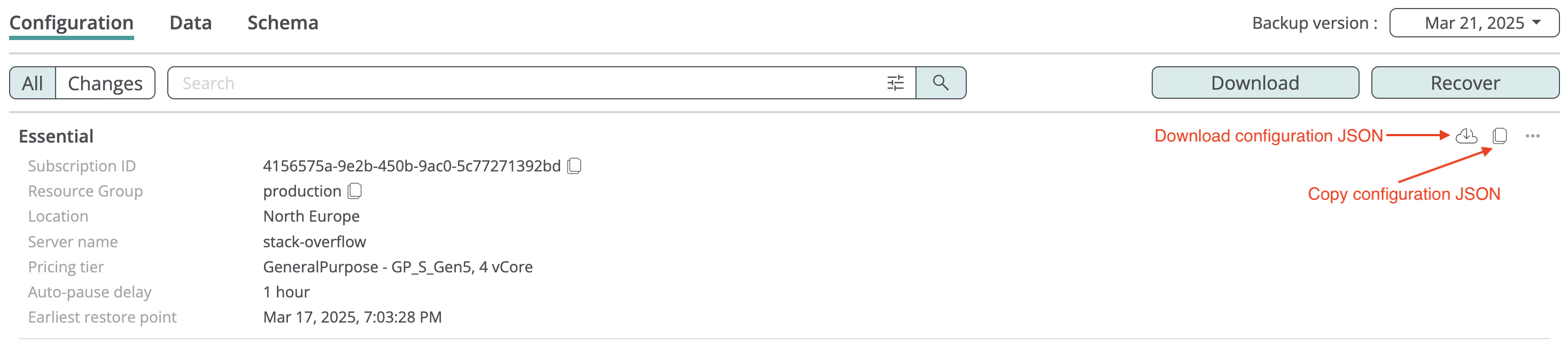 You can copy or download a JSON with the Azure configuration of a database and its SQL server from the backup browse view.