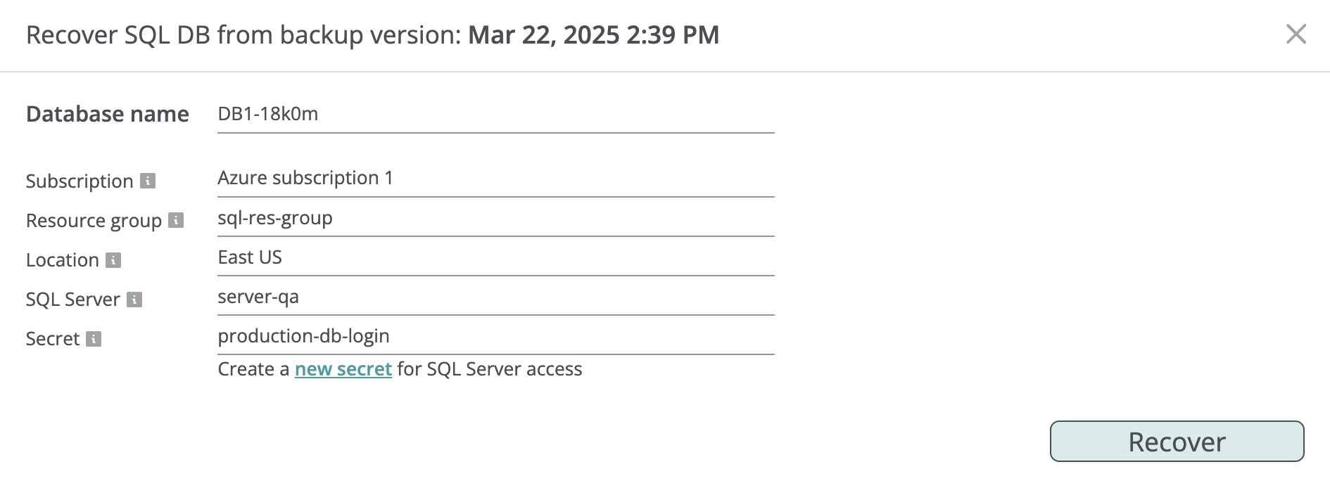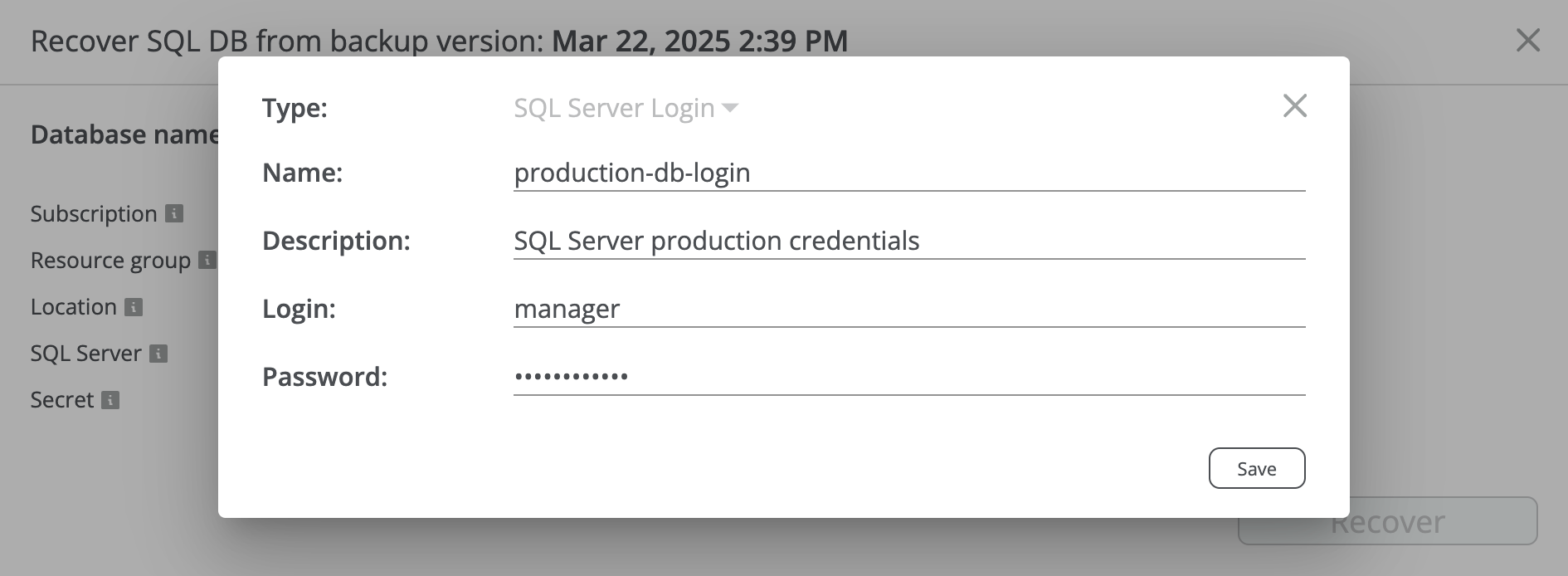 You can create a secret (login/password pair) for SQL Server access directly in the recovery dialog by entering the login and password that Afi will use to connect to the server. The secret is securely stored on the Afi side in encrypted format and can be reused for future recoveries with that server.