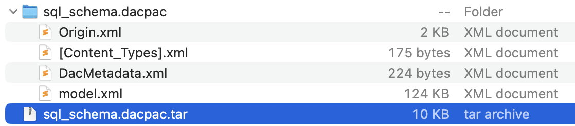To view the contents of a DACPAC file locally, add the .tar extension to the file name and unpack it as an archive:
