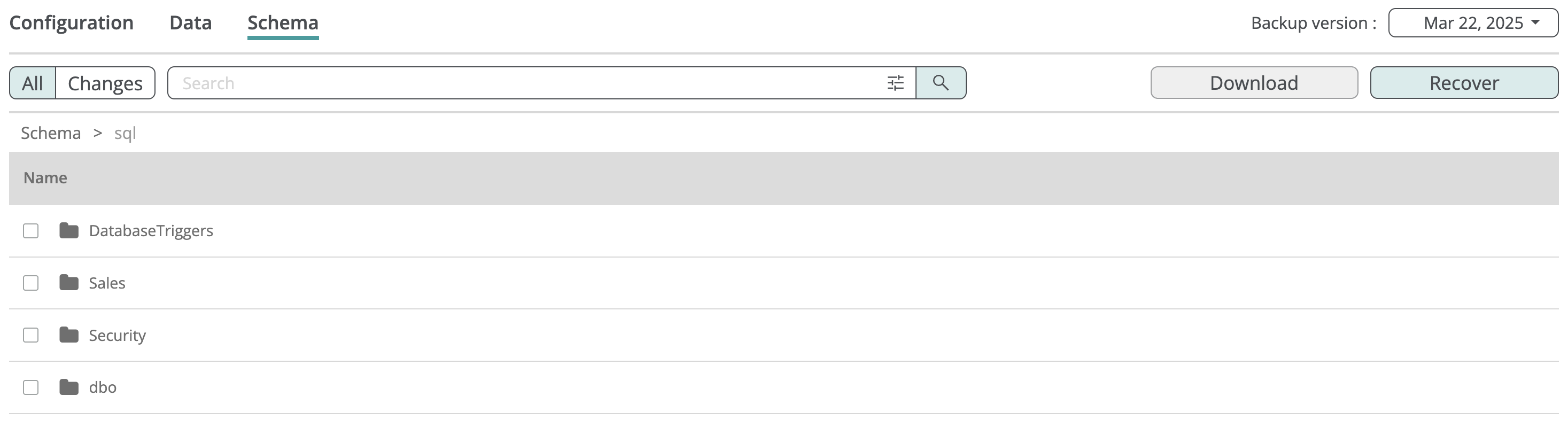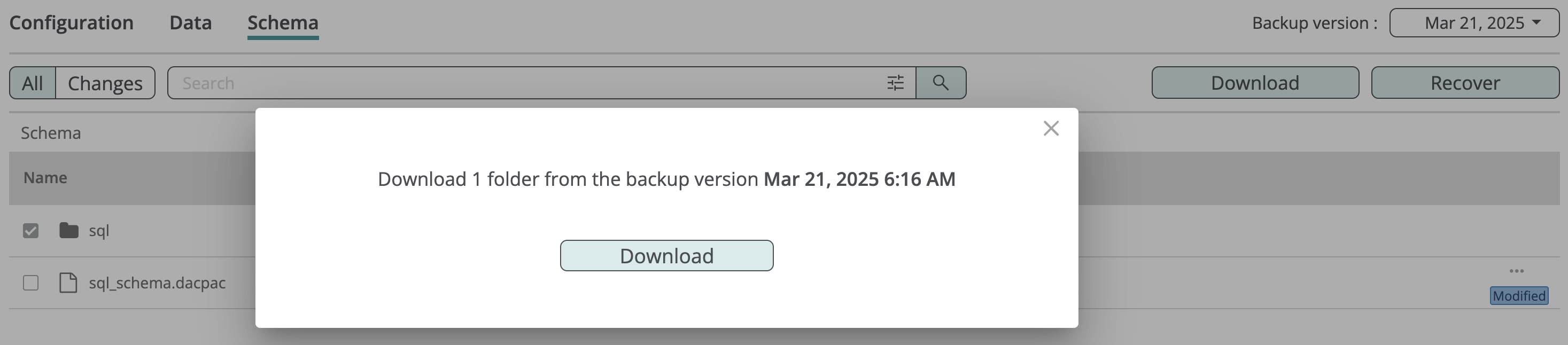 At the root of the schema browse view, you can find an sql_schema.dacpac file containing the complete description of the database’s data structure in DACPAC format. You can use this file to recreate the database with the same data structure configuration as the original.