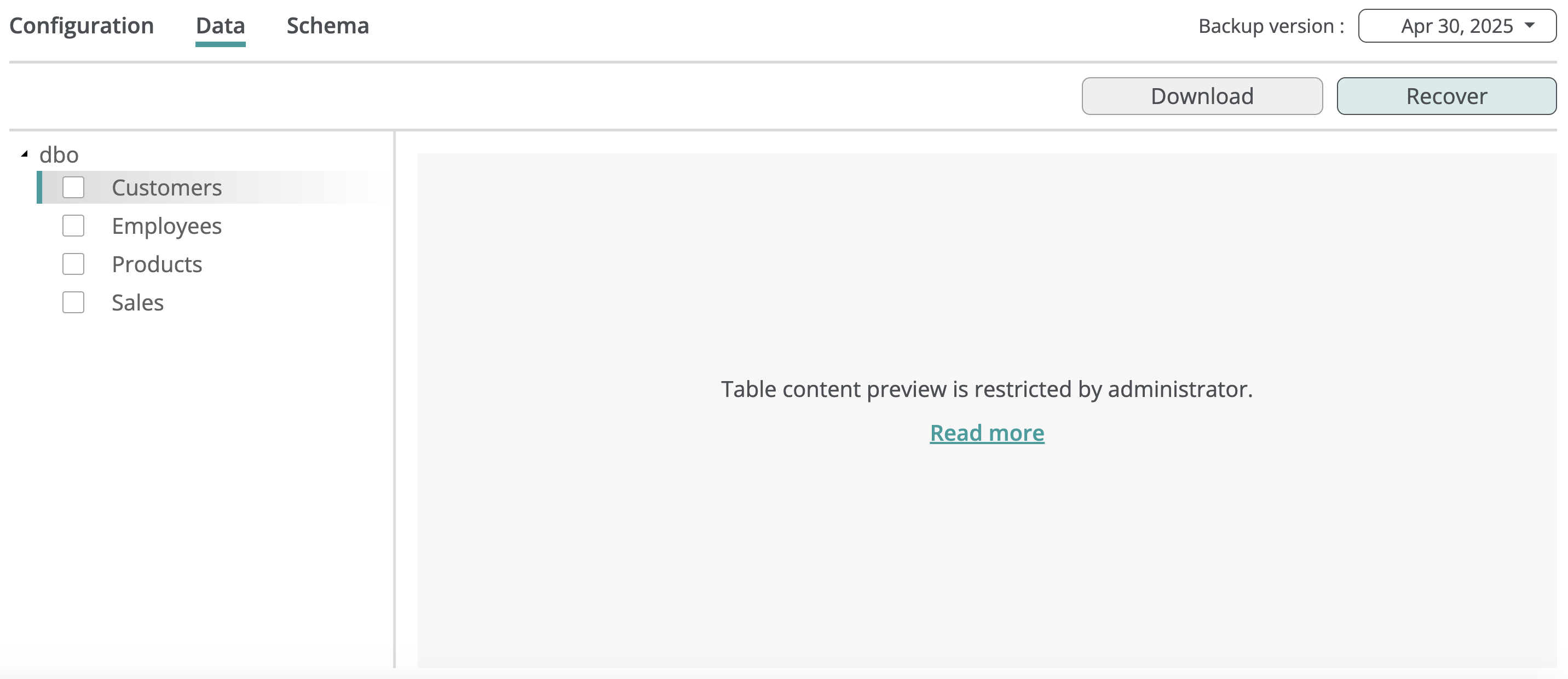 - Click Recover in the database backup browse view to open the recovery dialog.