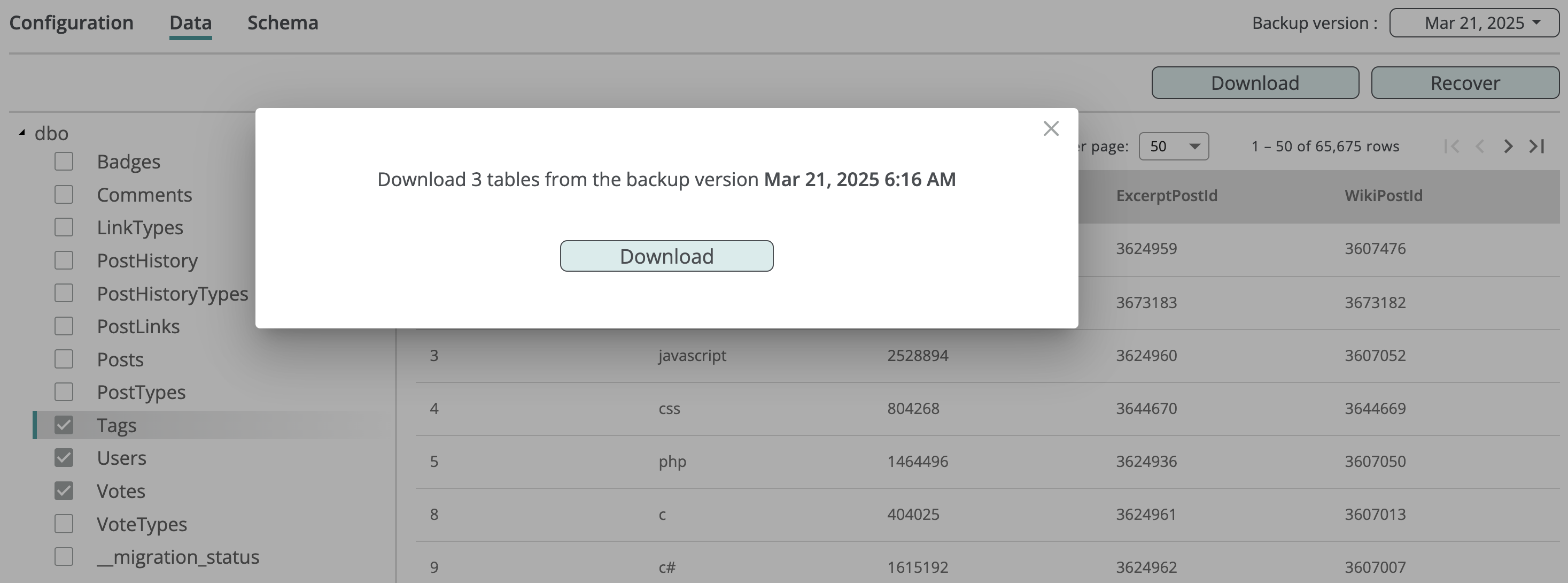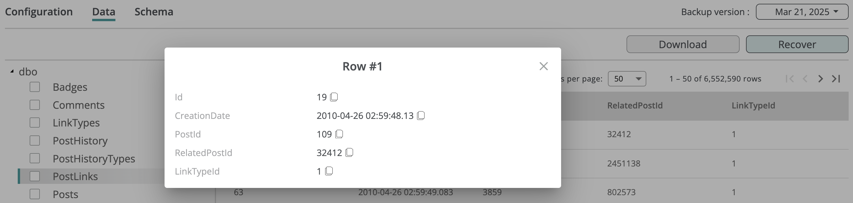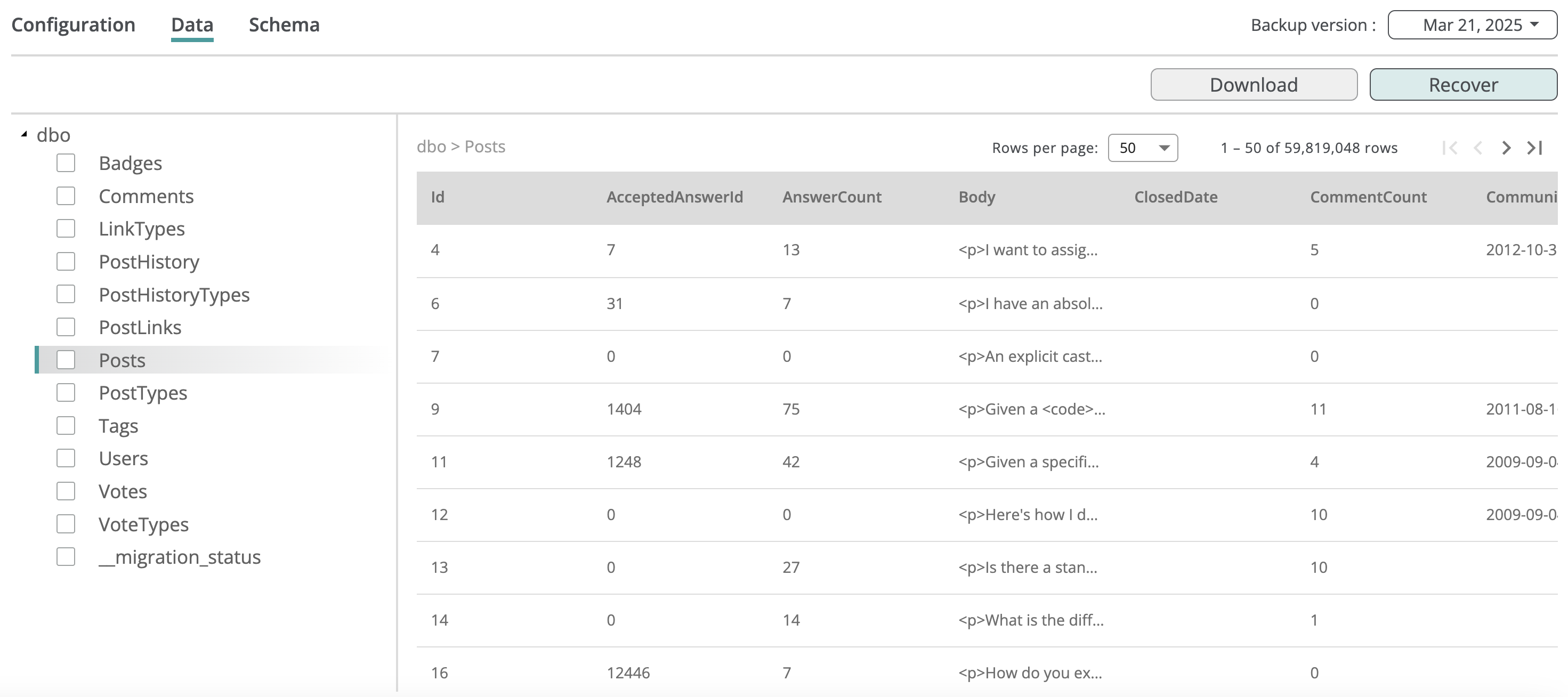 Inside the database backup, you can browse its configuration, schema, and table data.