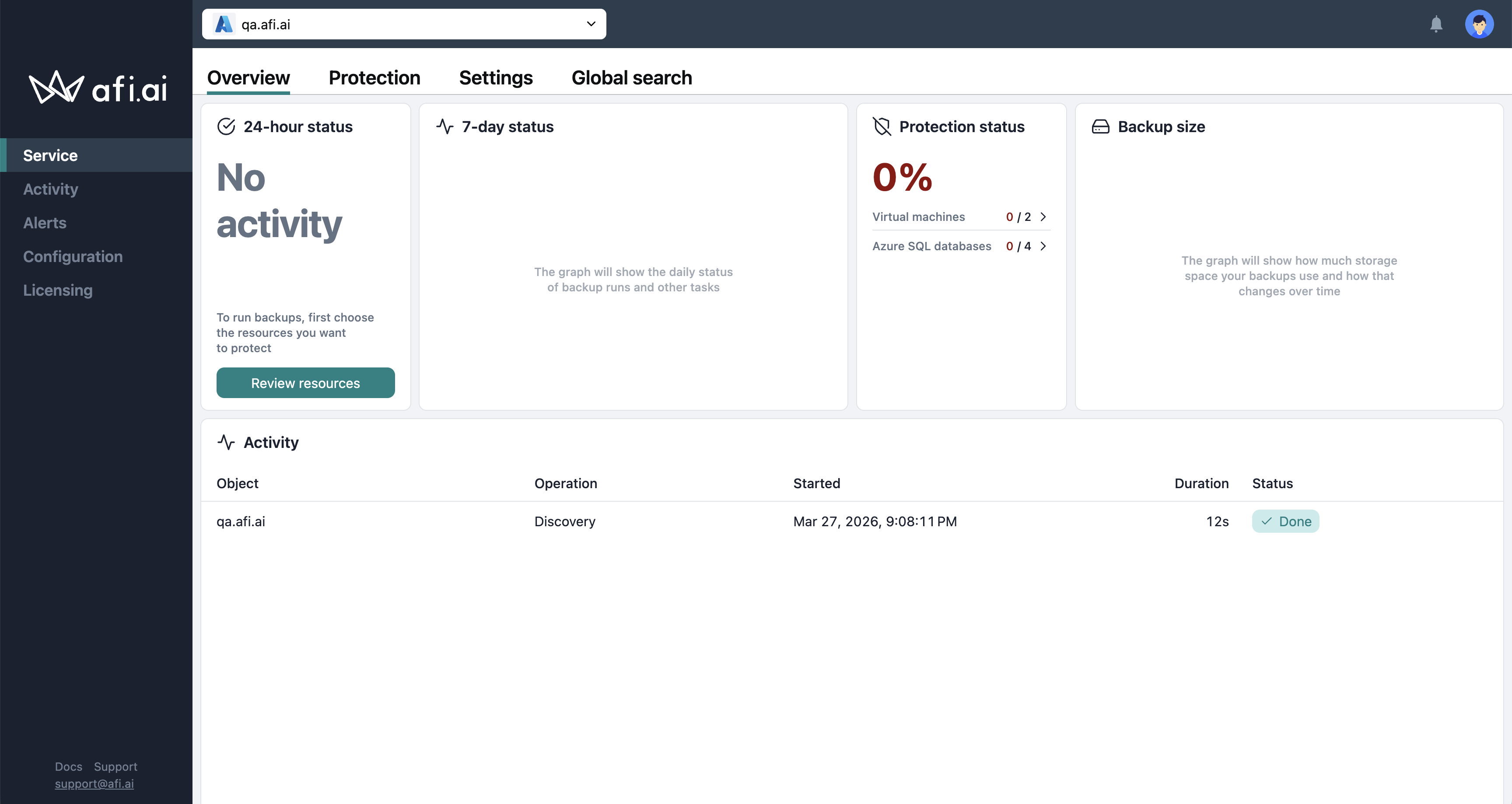 After onboarding, Afi starts an initial discovery of Microsoft Azure resources. This can take up to a few minutes depending on the tenant size and the infrastructure complexity. When complete, you’ll be redirected to the Afi portal and receive an email notification that your tenant is ready. If anything goes wrong during this step, please contact the Afi Support.