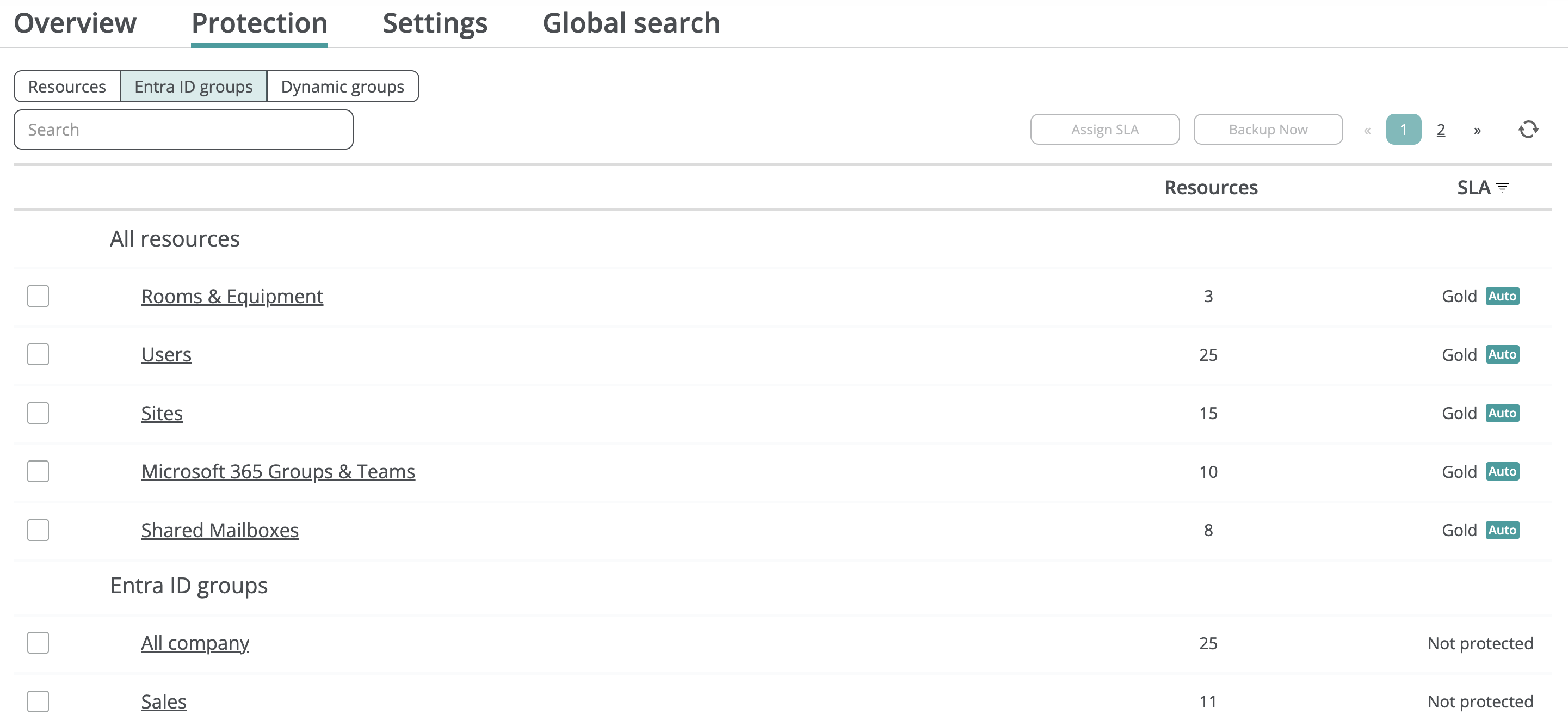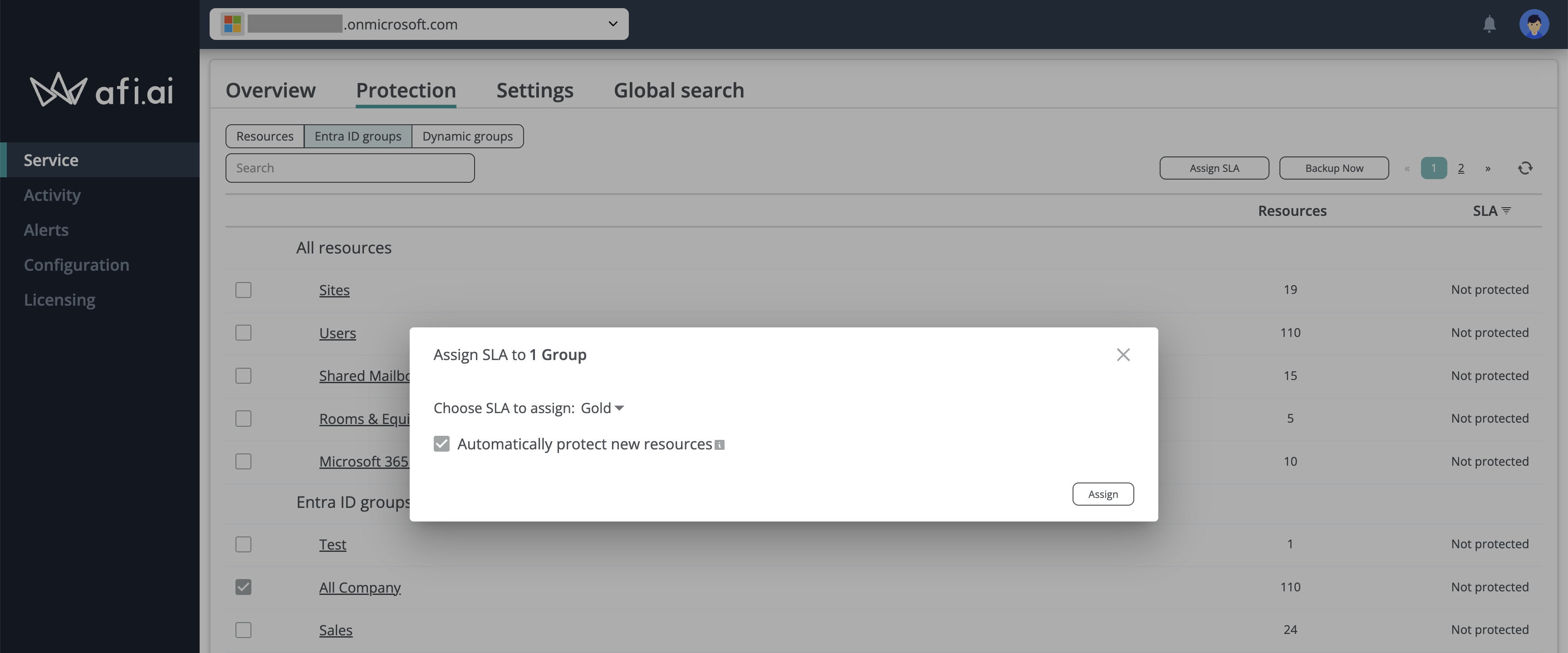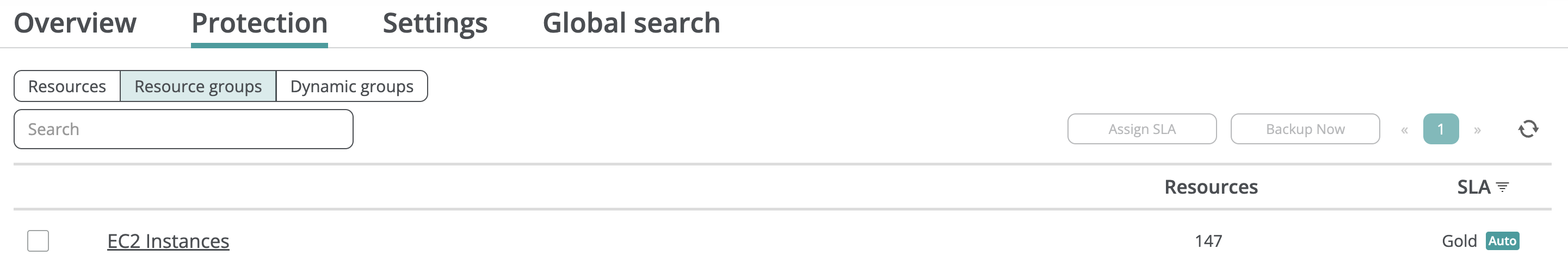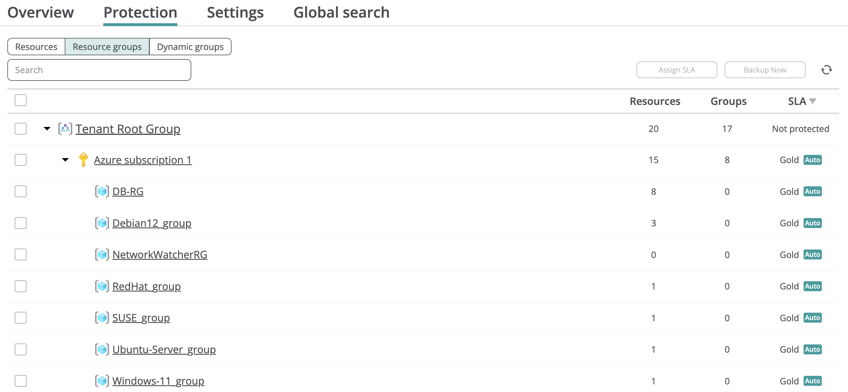 To protect all resources in a default or dynamic resource group, select this group on the corresponding tab, click Assign SLA, and choose a backup SLA policy to be assigned to resources in this group. To automatically protect resources added to the group later, keep Automatically protect new resources checked.