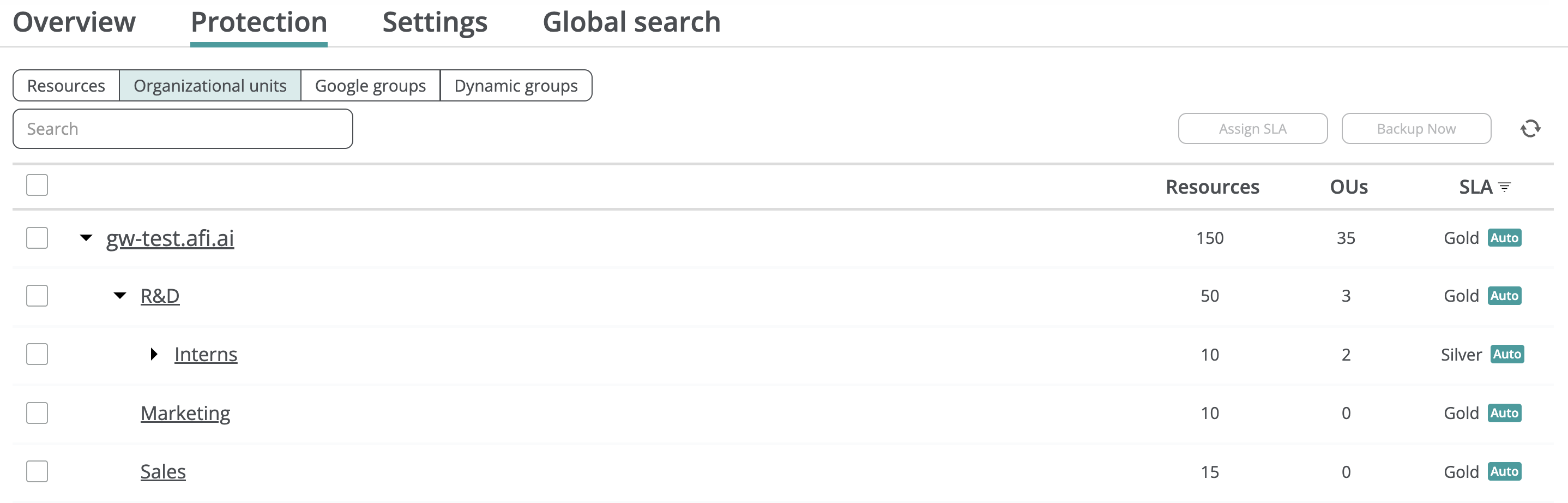 For Google Workspace tenants, Afi discovers organizational units and Google groups in the tenant and displays them on the Service → Protection → Organizational units and Service → Protection → Google groups tabs, respectively.