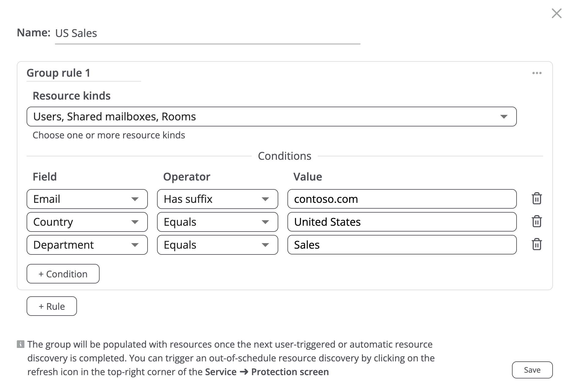 To enable automatic protection and access management for resources that match specific criteria, Afi relies on system- and user-defined resource groups. Groups can be populated by resource kind, by provider-native groups (for example, Google organizational units or Microsoft Entra ID user groups), or by user-defined rules. An Afi account administrator can assign a backup SLA policy to a resource group to protect all its current and future members, and can grant selected users access to all resources in specified resource groups.