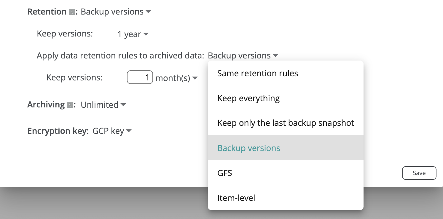 In addition to archiving rules, you can choose whether the system should apply the same or different retention rules for active and archived backups by selecting one of the options in the Apply data retention rules to archived data dropdown (by default, the same retention rules apply to active and archived resources):