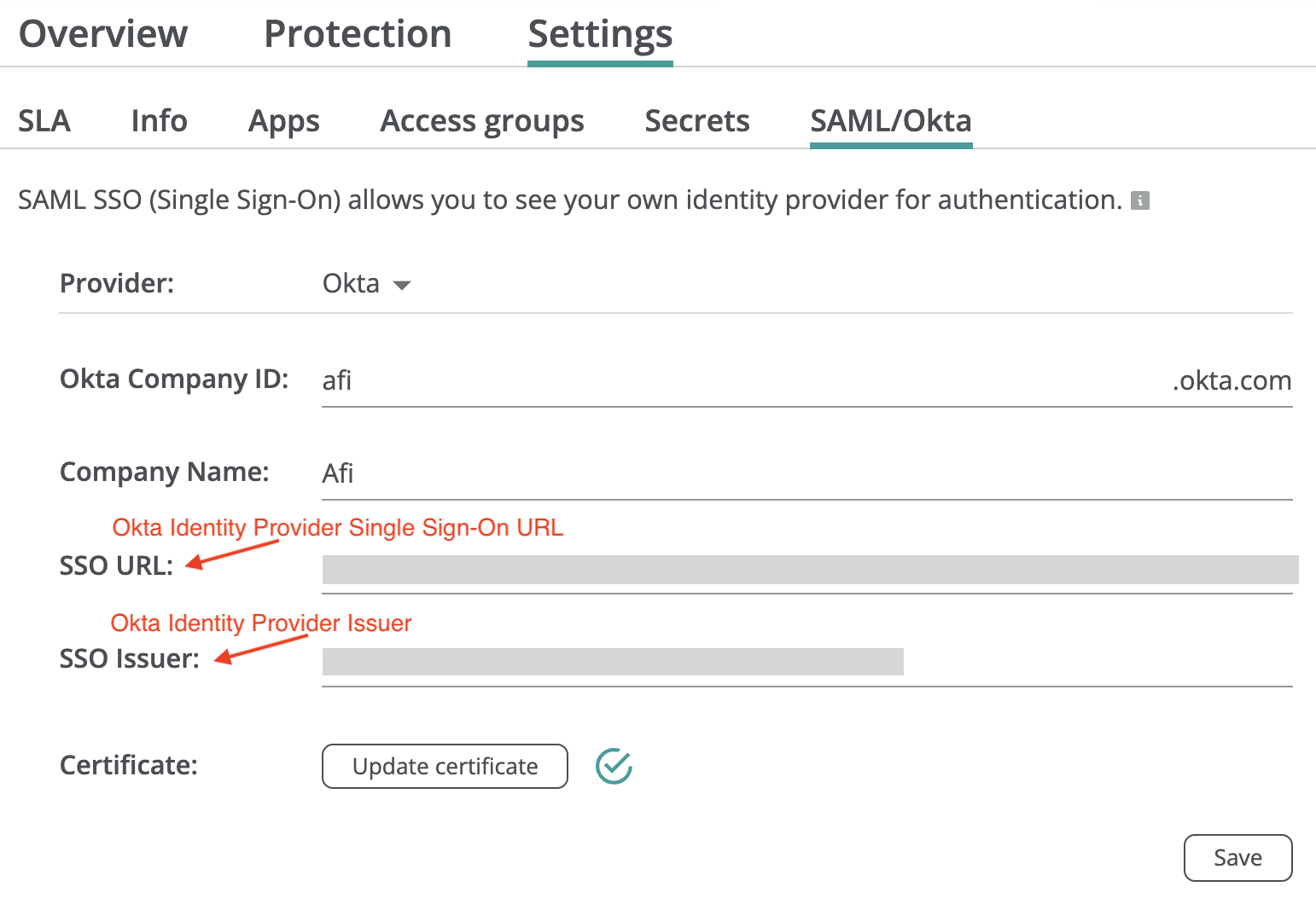 Now you are ready to finish Okta authentication configuration on the Afi side. Please go to the Service → Settings → Okta tab in the Afi portal, fill the provided fields and press Save.