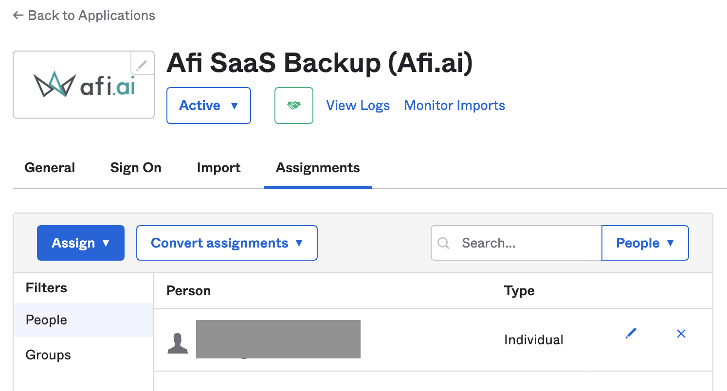 You can assign users who should be able to access Afi through Okta via the application's Assignments tab: