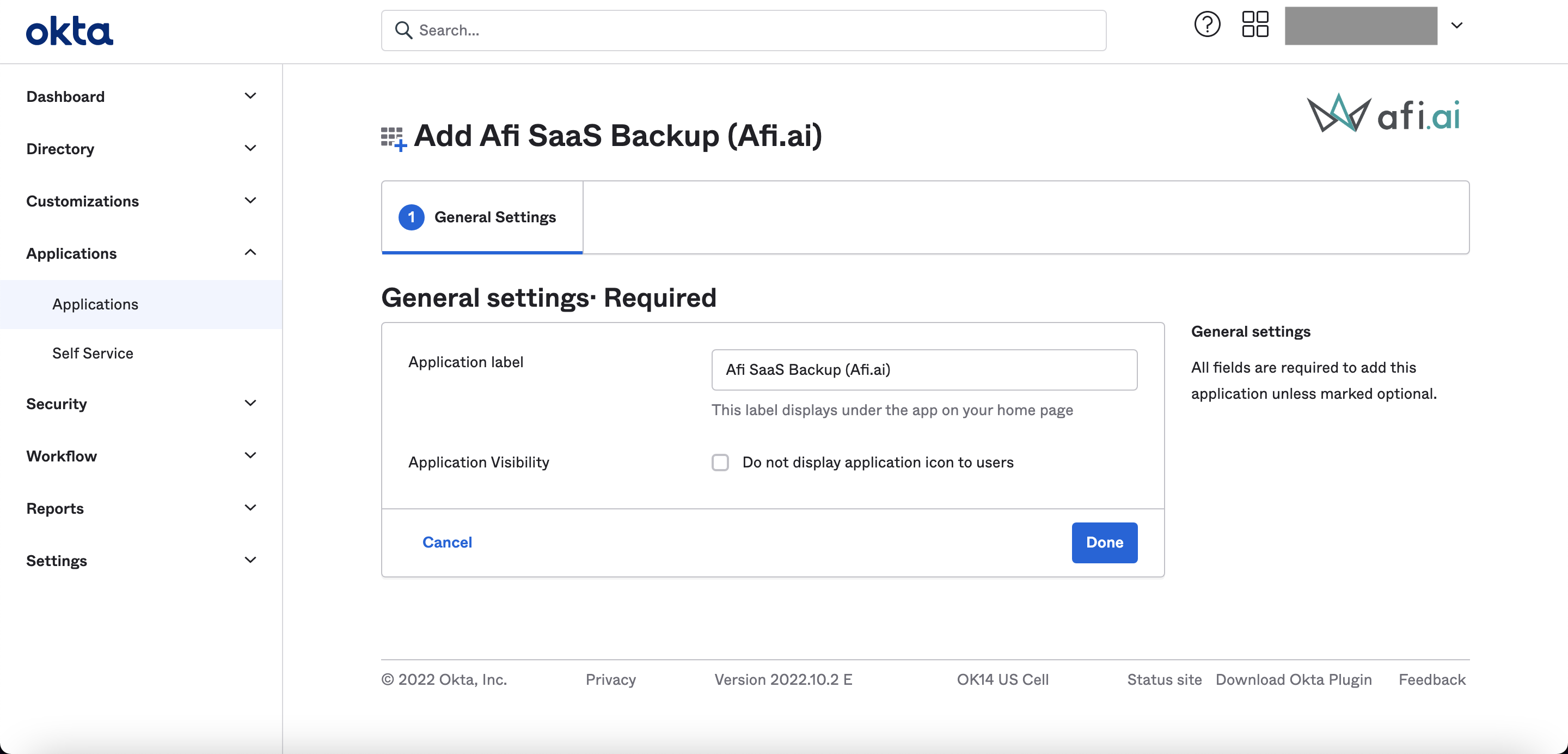 As a first step, please log in to your Okta administrator account and install the Afi application from Okta Integrations marketplace.