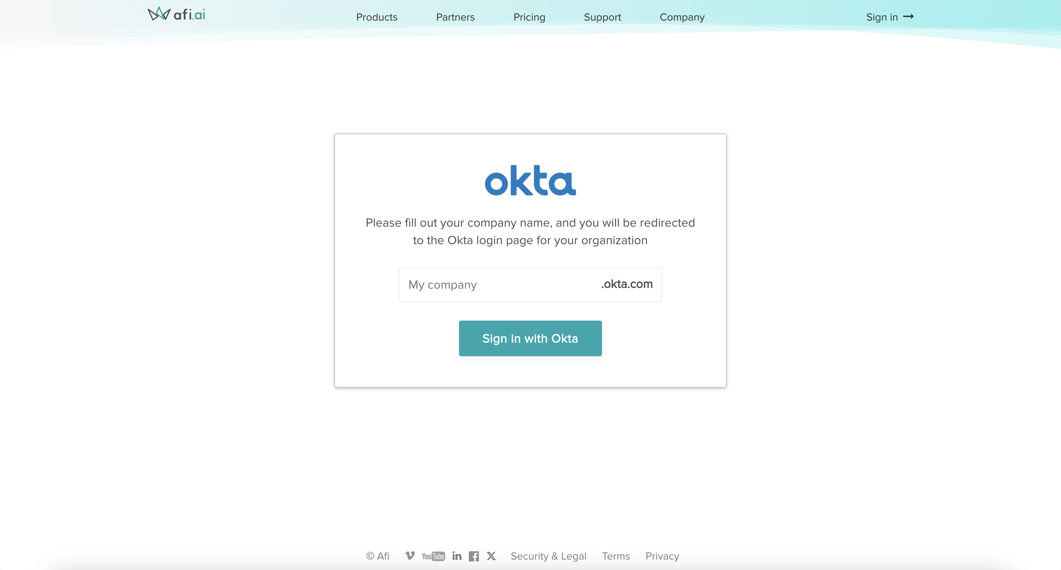 Service provider-initiated flow starts on the custom Afi login screen for Okta where a user is prompted to enter their Okta company ID and then proceed with Okta authentication. Upon successful authentication, the user will be redirected to the Afi portal.
