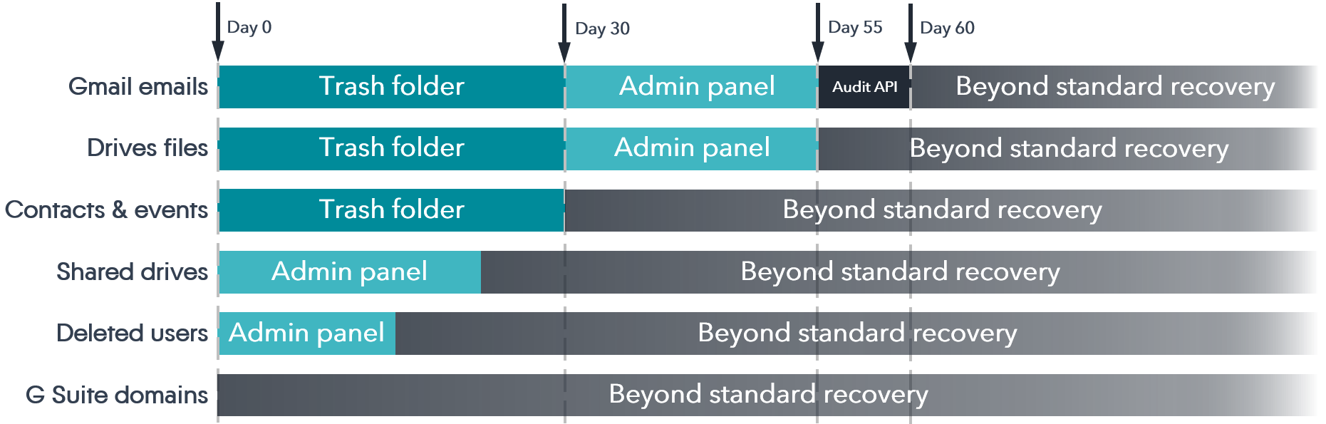 In most cases, if you rely on standard built-in G Suite data recovery, you are limited to 30-60 days after the data loss event.