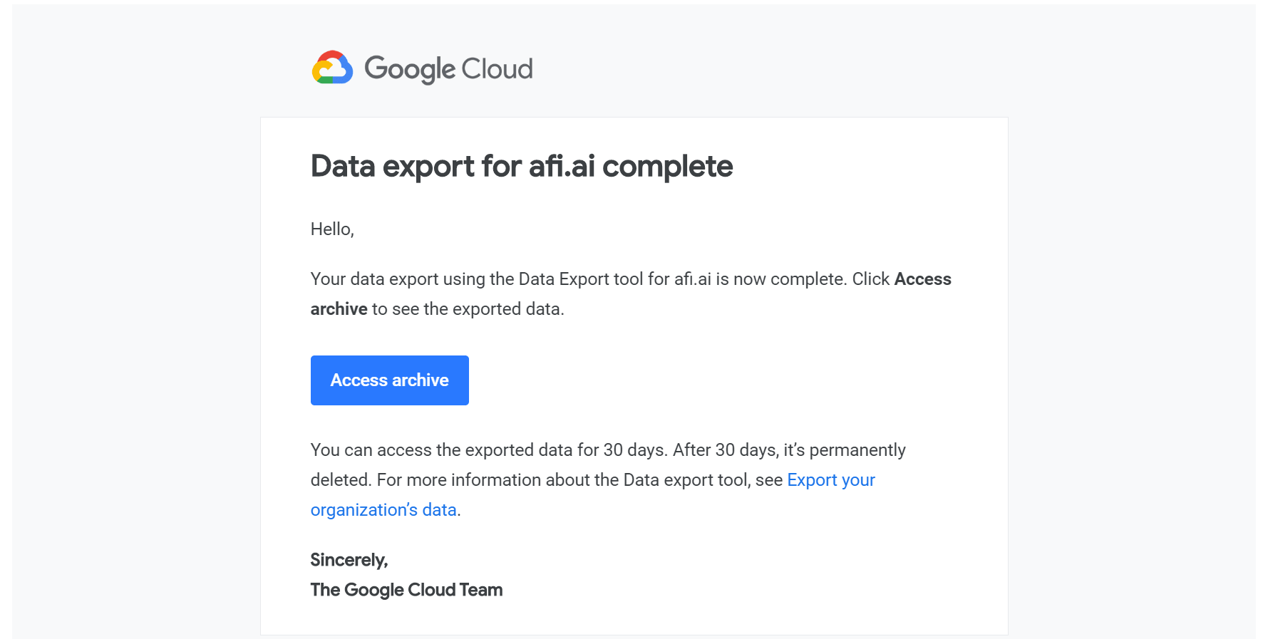Confirmation email indicating that the export is complete