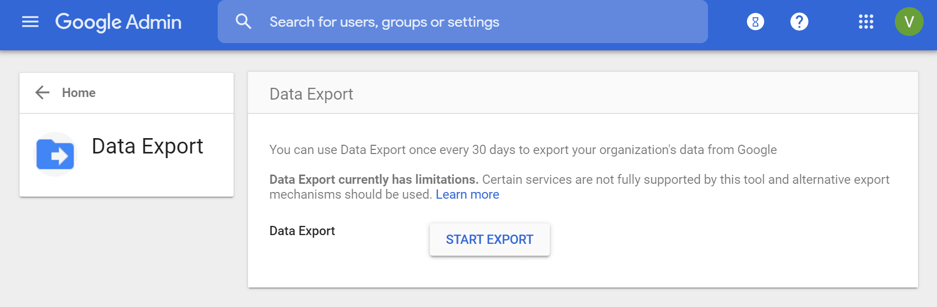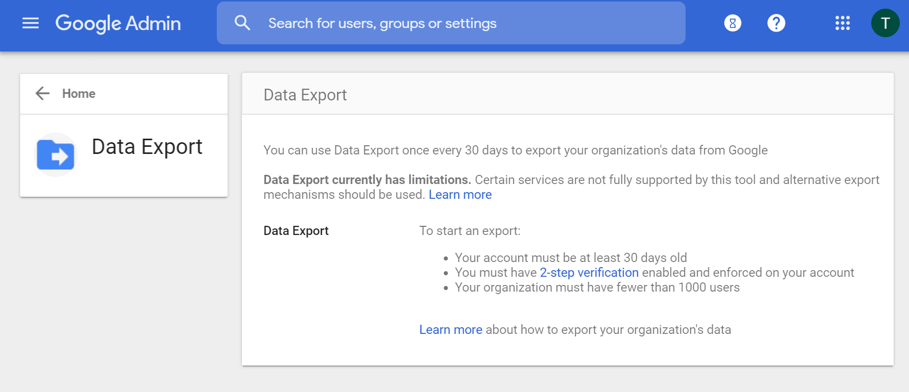 You need to meet 3 requirements to be able to use Takeout. Firstly, your administrator account which you’re using for the data export needs to be at least 30 days old. Secondly, the admin account has to have 2-factor authentication enabled and enforced. Finally, you Google Workspace domain should have less than 1,000 users.