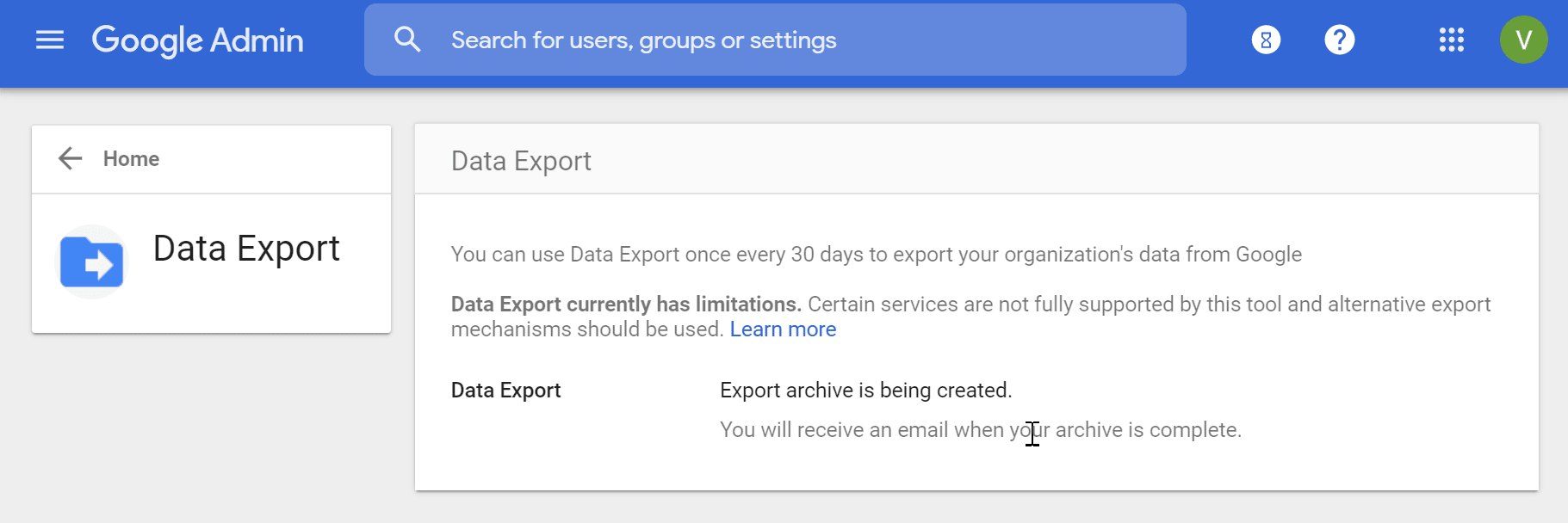 Once you click the "Start Export" button, Google will inform you that the data is being exported.