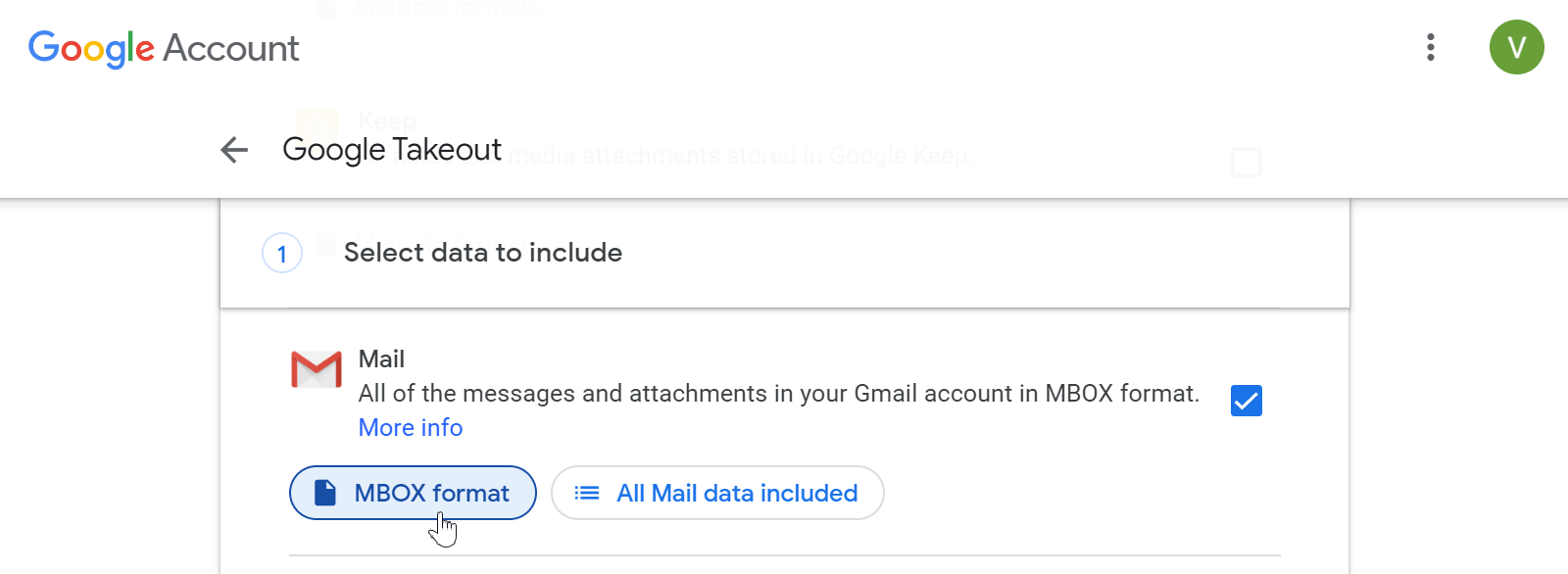 If you want to use Takeout to back up data from a personal Gmail account, then you need to use a different link. Tick the checkbox in Mail section in order to download your email messages in MBOX format.