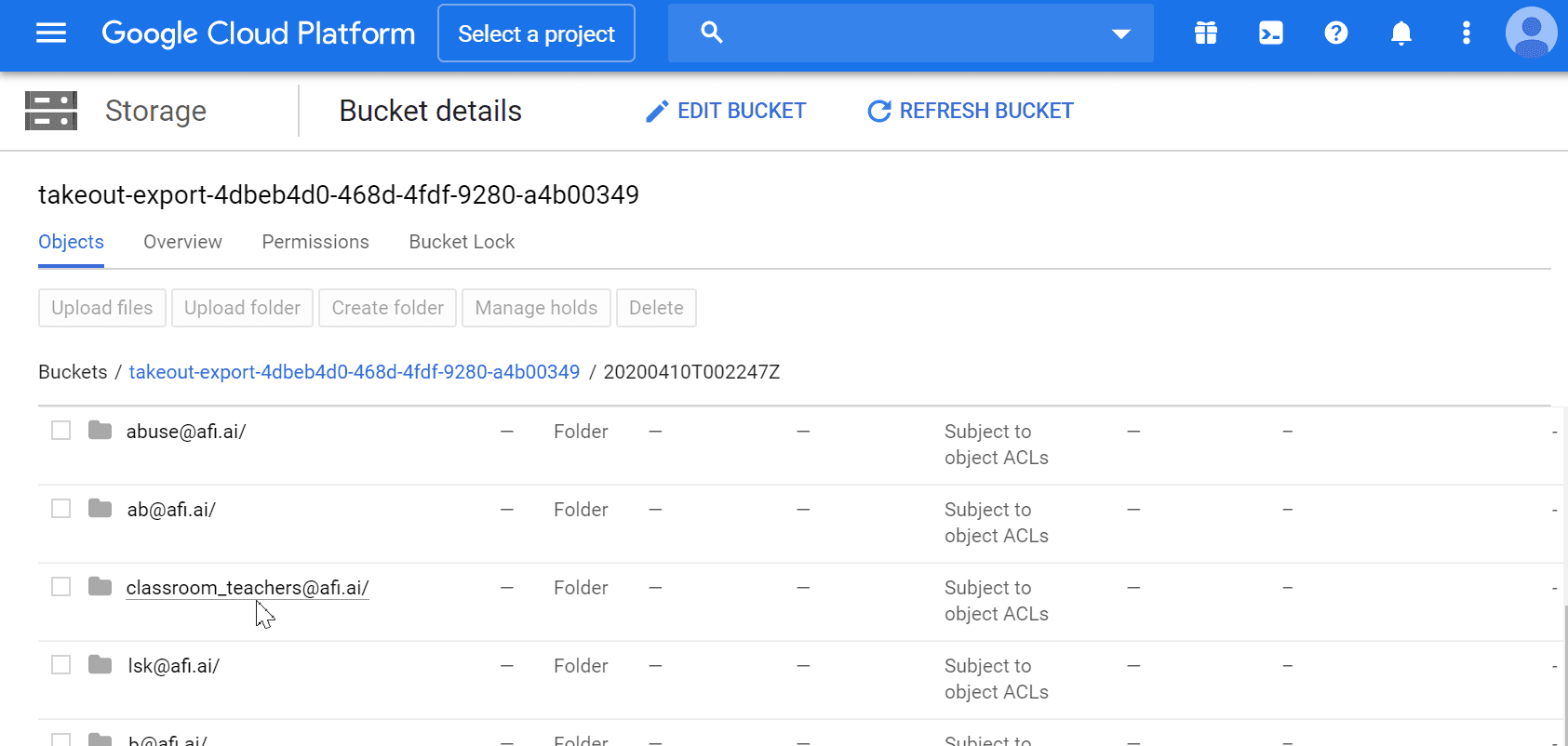 Google Cloud storage bucket with Takeout data export