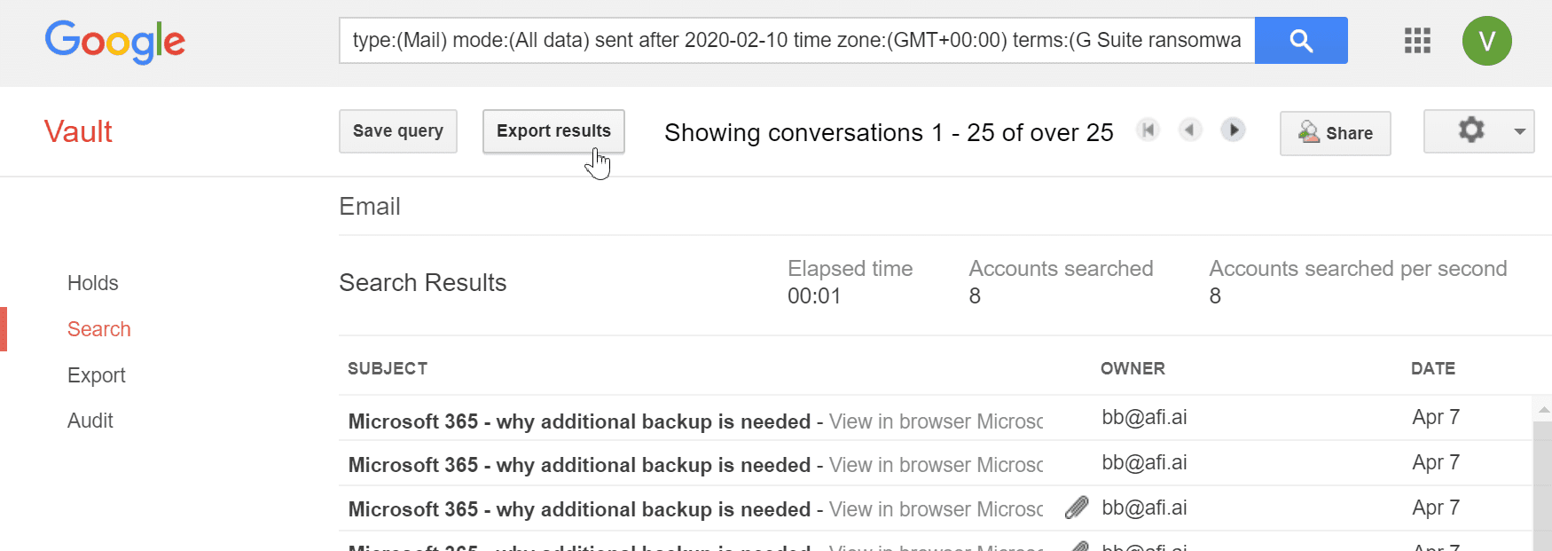 - Use exported data if you need to restore emails deleted 30+ days ago